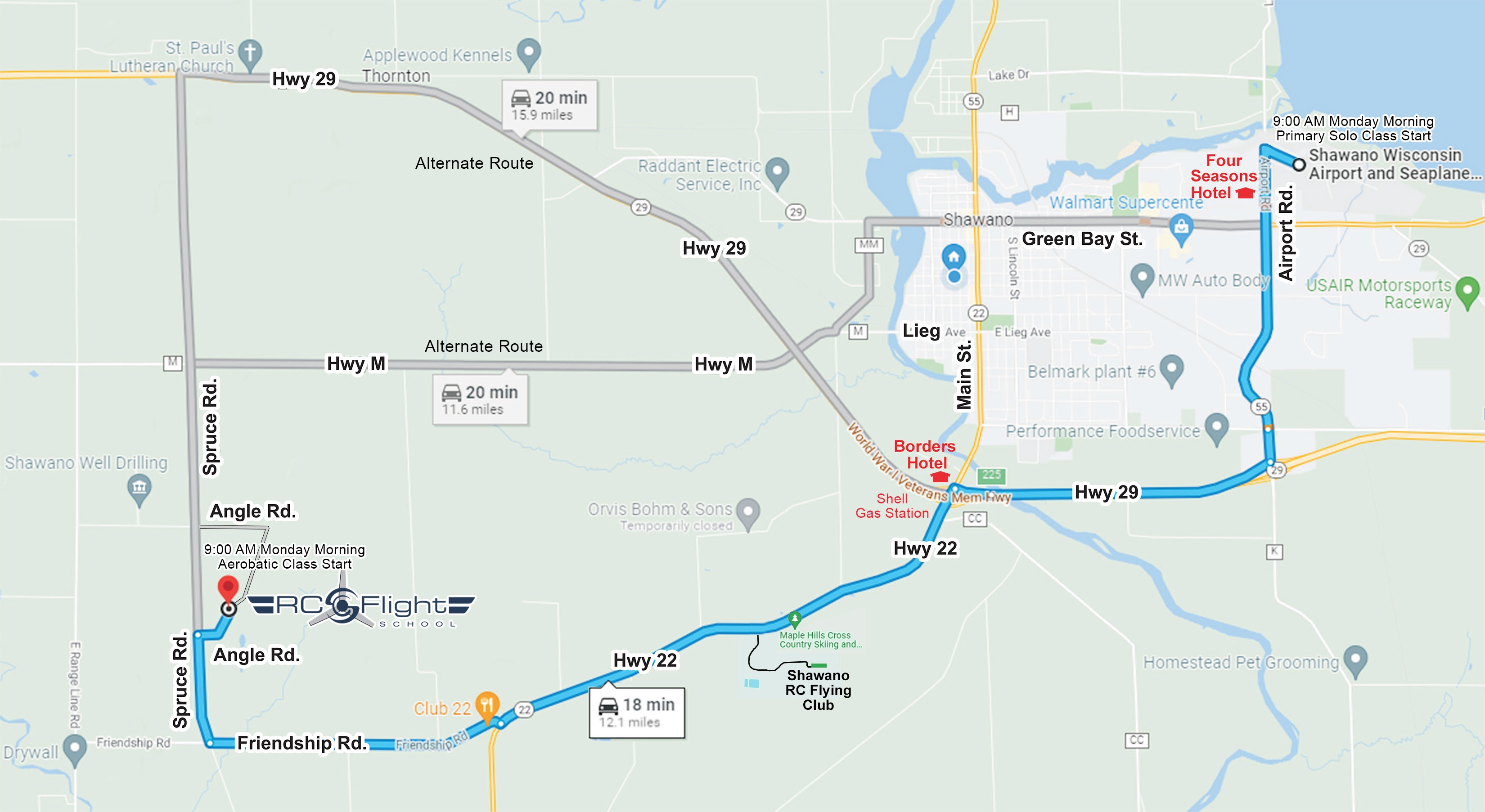 Solo Courses begin Monday at 9:00 A.M. with Ground School located at the Shawano Municipal Airport: 248 Airport Rd, Shawano, WI 54166 After a 2 hr Ground School the class will convoy to the School flying site (18 min.) Map